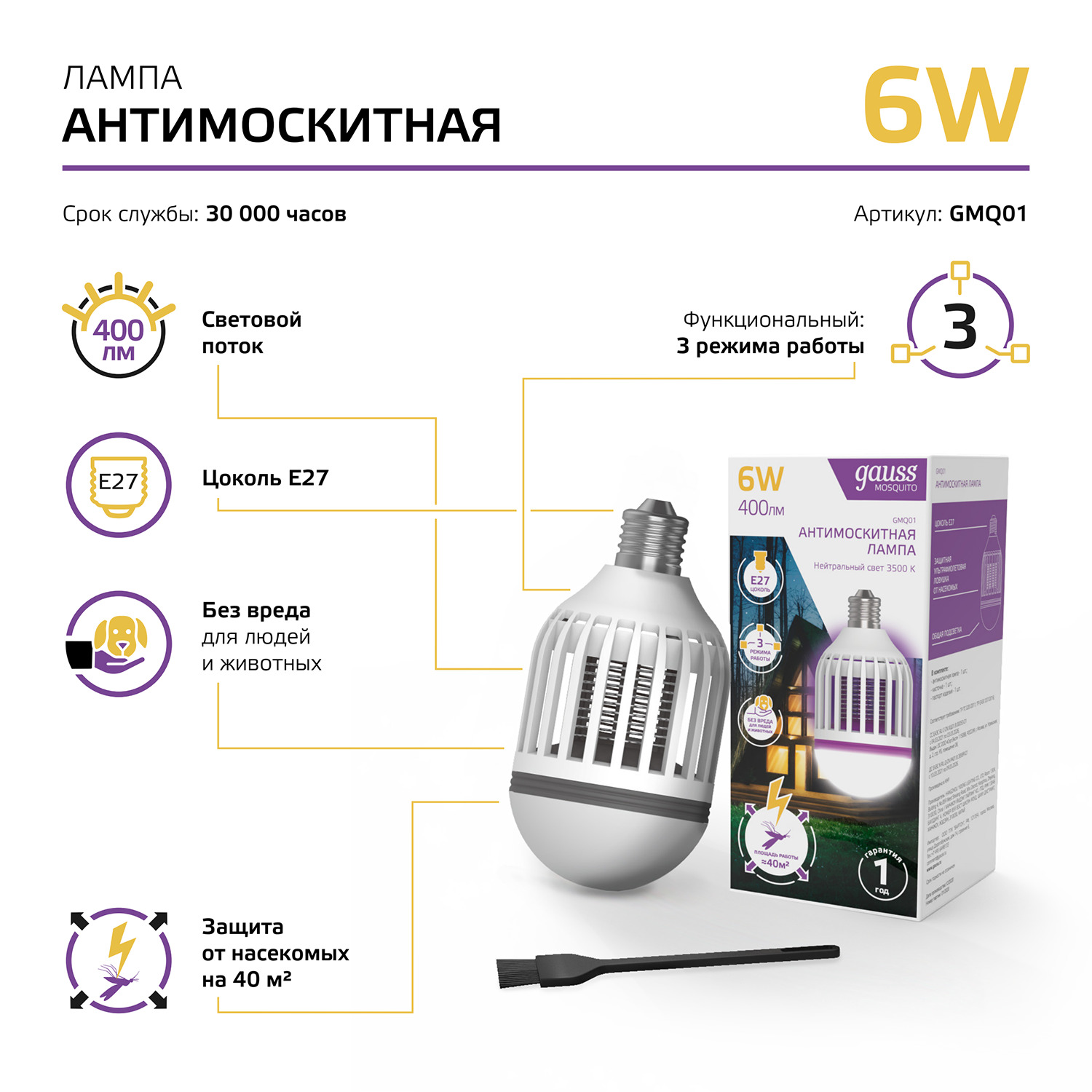 Комары и мошки мешают отдыху на природе или даче. Чтобы вы могли вне обыденной суеты наслаждаться атмосферой расслабленности мы с радостью готовы предложить наши антимоскитные светильники. Независимо от дня недели и времени суток эти световые устройства защитят вас от внешних раздражителей, как внутри помещения, так и снаружи, например, в беседке, террасе или туристической палатке. Антимоскитная лампа с цоколем Е27 имеет 2 основных режима работы: режим защиты от насекомых с ультрафиолетовым излучением и комбинированный режим свечения с цветовой температурой 3500К с подсветкой и защитой от насекомых. Ультрафиолет притягивает комаров, мотыльков и других летающих насекомых, а за счет напряжения исходящего от светильника при соприкосновении со стенкой они погибают. Кисточка, предоставляемая в комплекте, позволяет быстро и легко очистить светильник от насекомых.