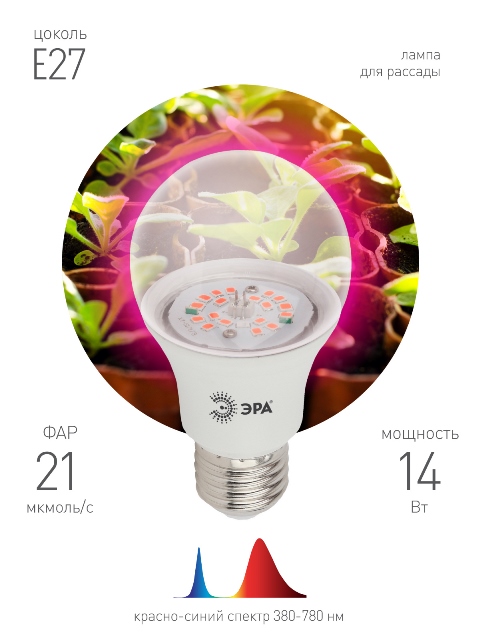 Лампа ЭРА FITO-14W-RB-E27-K мощностью 14 Вт лучший помощник для домашних растений. Вы сможете озеленить свое пространство на кухне, балконе или подоконнике! Оптимальное расстояние до листьев 10-15 см. Важно: расположение на высоте более 40 см не дает должного эффекта при выращивании для любой фитолампы аналогичной мощности. Красно-синий спектр активизирует процесс фотосинтеза и работу хлорофиллов, помогает укрепить корневую систему, ускоряет темпы выработки глюкозосодержащих веществ. Прозрачный рассеиватель лампы увеличивает эффективность эксплуатации почти вдвое по сравнению с матовым рассеивателем. Эффективная площадь выращивания около полуметра. Фитосветильник не представляет угрозы для глаз животных и человека! Приятный розовый оттенок с отсутствием пульсаций не будет давить на глаза. Лампа оснащена эффективными светодиодами, поэтому ее нагрев минимален. Розовая лампа подойдет как для взрослых растений, так и для рассады. Идеальна для выращивания помидоров, баклажанов, перцев. Возможна эксплуатация даж