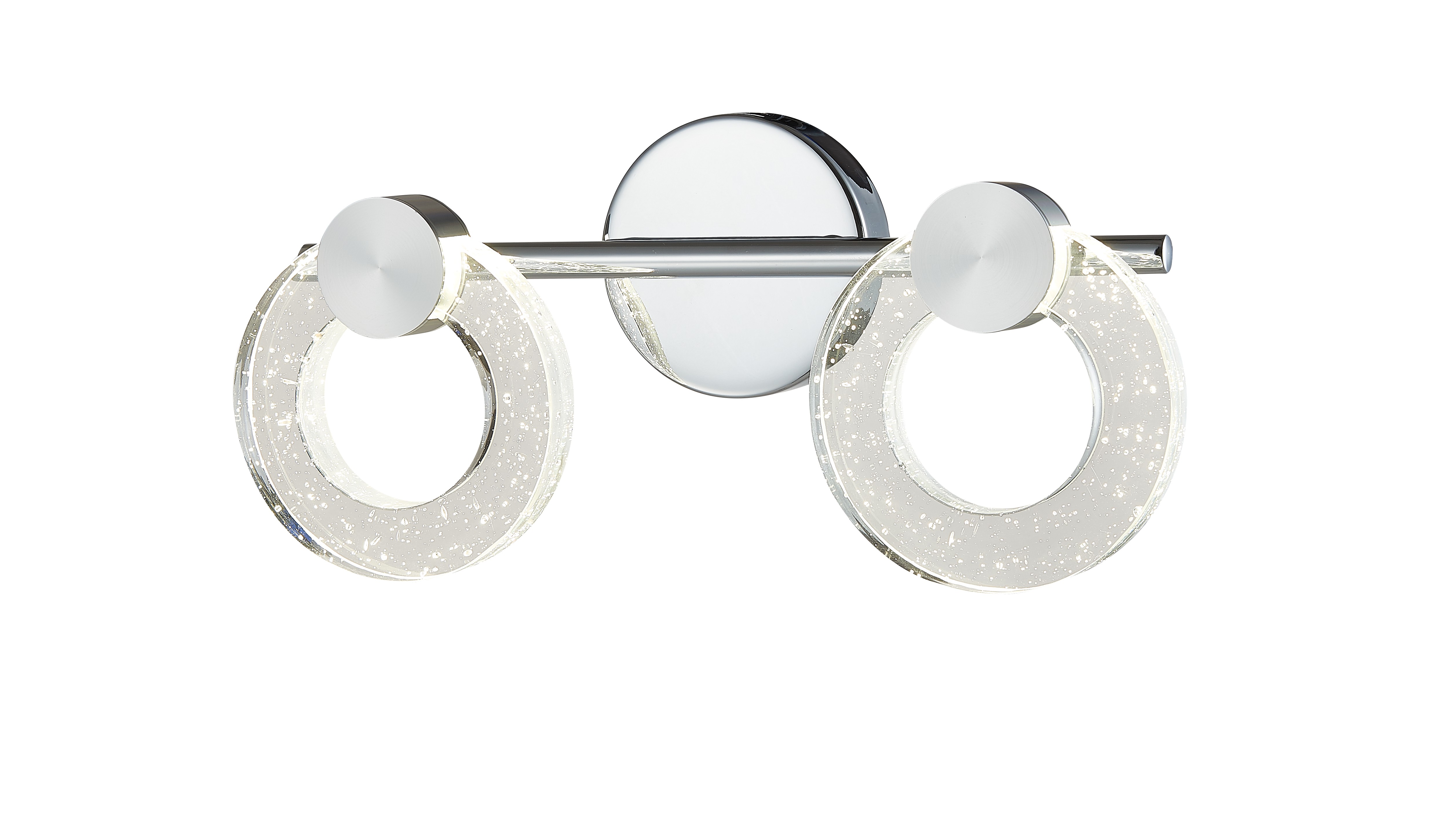 Бра из металла цвета хром с массивными хрустальными кольцами и элементами цвета полированного серебра. Источник света LED 2х4W 4000К. H194mm x L410mm x W89mm