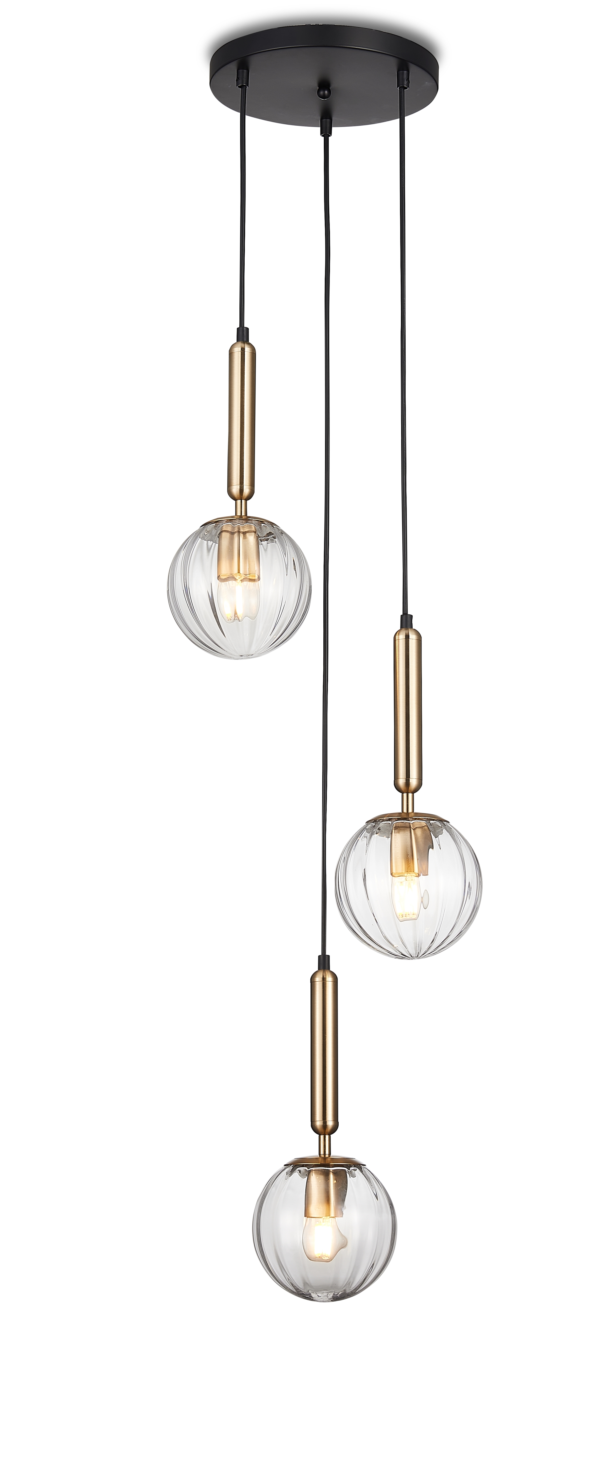 Подвес на круглом основании из металла черного цвета, черными проводами, металлическими продолговатыми элементами цвета бронзы и 3-мя плафонами из прозрачного стекла. D360mm, H1060-1860mm, 3хЕ27