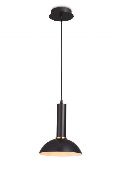 Подвес с черной потолочной чашей и черным проводом, верхней частью черного цвета и плафоном из металла черного цвета снаружи и белого внутри. Без рассеивателя. D230mm, H285-1785mm. 1ХЕ27