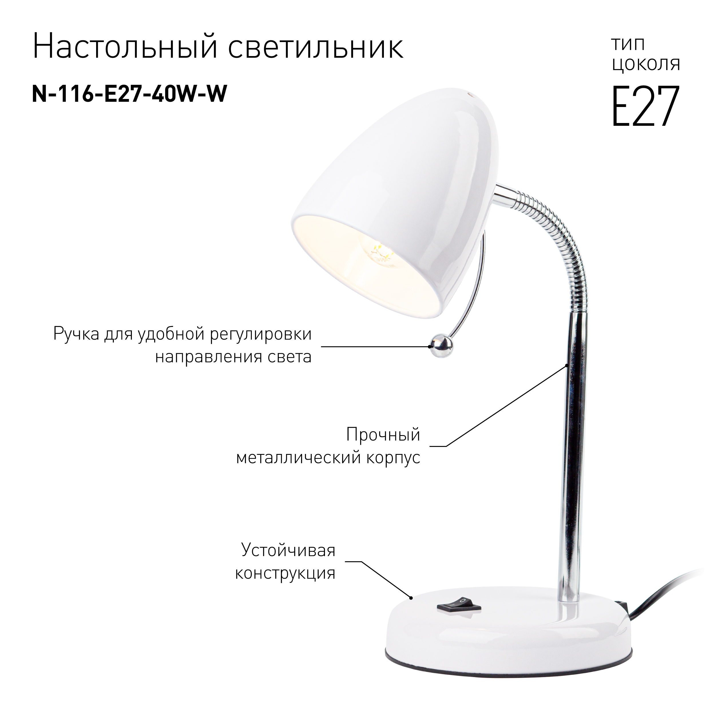 Настольный светильник ЭРА N-116-Е27-40W-W с цоколем Е27 компактного размера для удобного размещения на столе. Может использоваться с лампой накаливания, компактной люминесцентной лампой (КЛЛ) или светодиодной (LED) лампой. У светильника металлические стойка и плафон, выключатель на основании. Высота расположения плафона регулируется сгибающейся стойкой, направление света - наклоном и поворотом плафона в любом направлении.