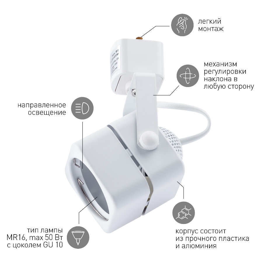 Трековый светильник TR10-GU10 WH под лампу выполнен в элегантном белом цвете. Он создаст необходимые акценты в пространстве помещения, выделит отдельные предметы, создаст яркую подсветку. Подобные светильники снабжены поворотным механизмом, который позволяет регулировать угол наклона, изменяя общий вид всего помещения. Источником света является лампа с цоколем GU10, что делает светильник максимально универсальным и дает возможность выбрать необходимую мощность, цветовую температуру и угол рассеивания. Светильник прослужит не менее 30000 часов, не требуя дополнительной замены источника света. Светильник классического белого цвета отлично впишется в любой дизайн, создаст необходимые акценты.