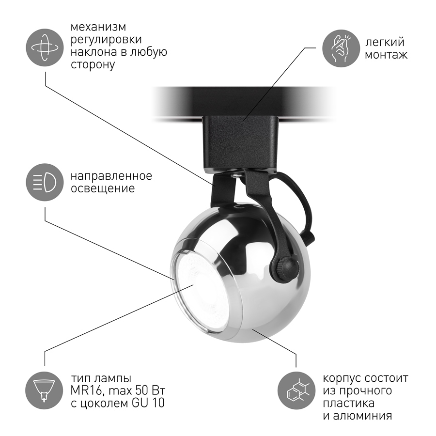 Трековый светильник TR35-GU10 CH под лампу MR16 хром однофазный