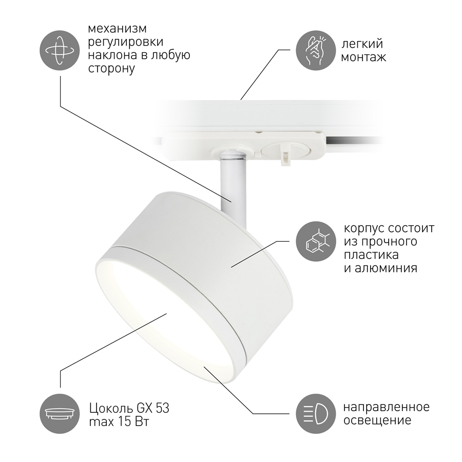 Однофазный трековый светильник под лампу с цоколем GX53 с плоским трековым адаптером. Корпус светильника выполнен из алюминия. Главной особенностью данной модели является компактный корпус, для такого вида светильников и утопленный трековый адаптер. Модель может быть достаточно яркой, при использовании ламп 12 ватт и создавать основное освещение, за счет широкого угла рассеивания GX53.