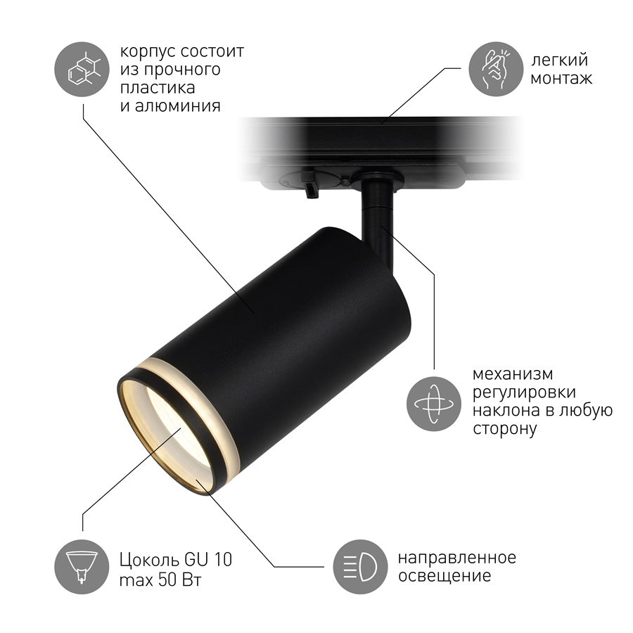 Однофазный трековый светильник под лампу с цоколем GU10. Светильник выполнен из алюминия, комплектуется утопленным трековым адаптером, который погружается в трековый шинопровод. На передней части светильника установлено акриловое кольцо, которое наполняется светом во время работы изделия.